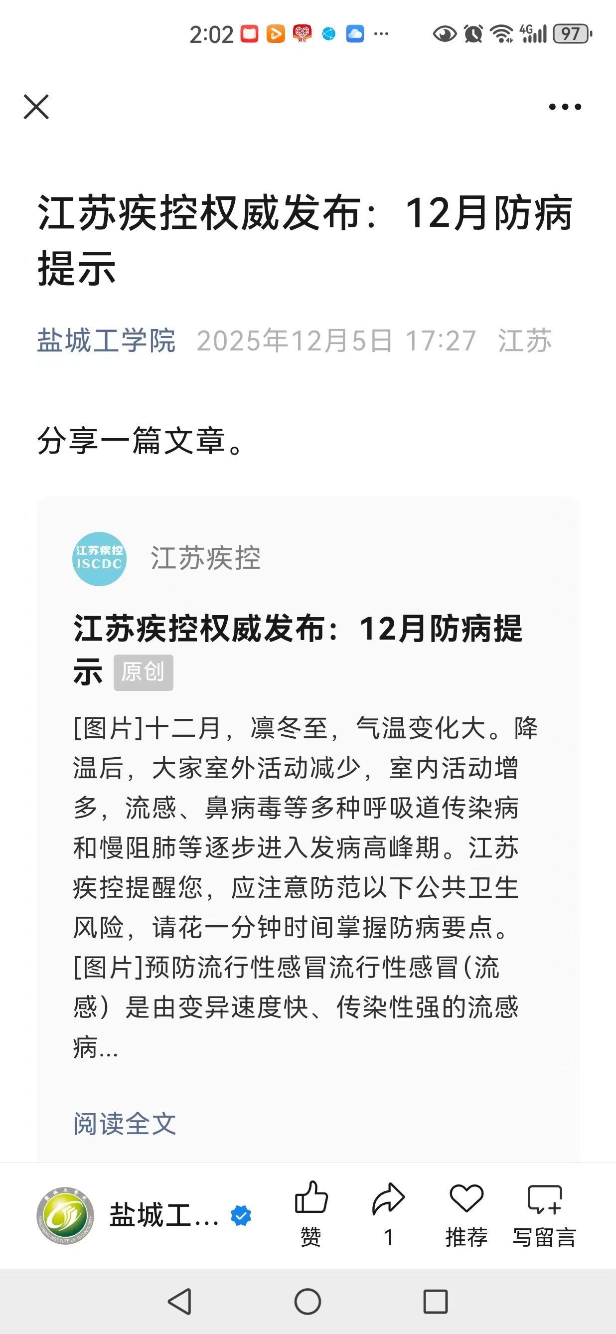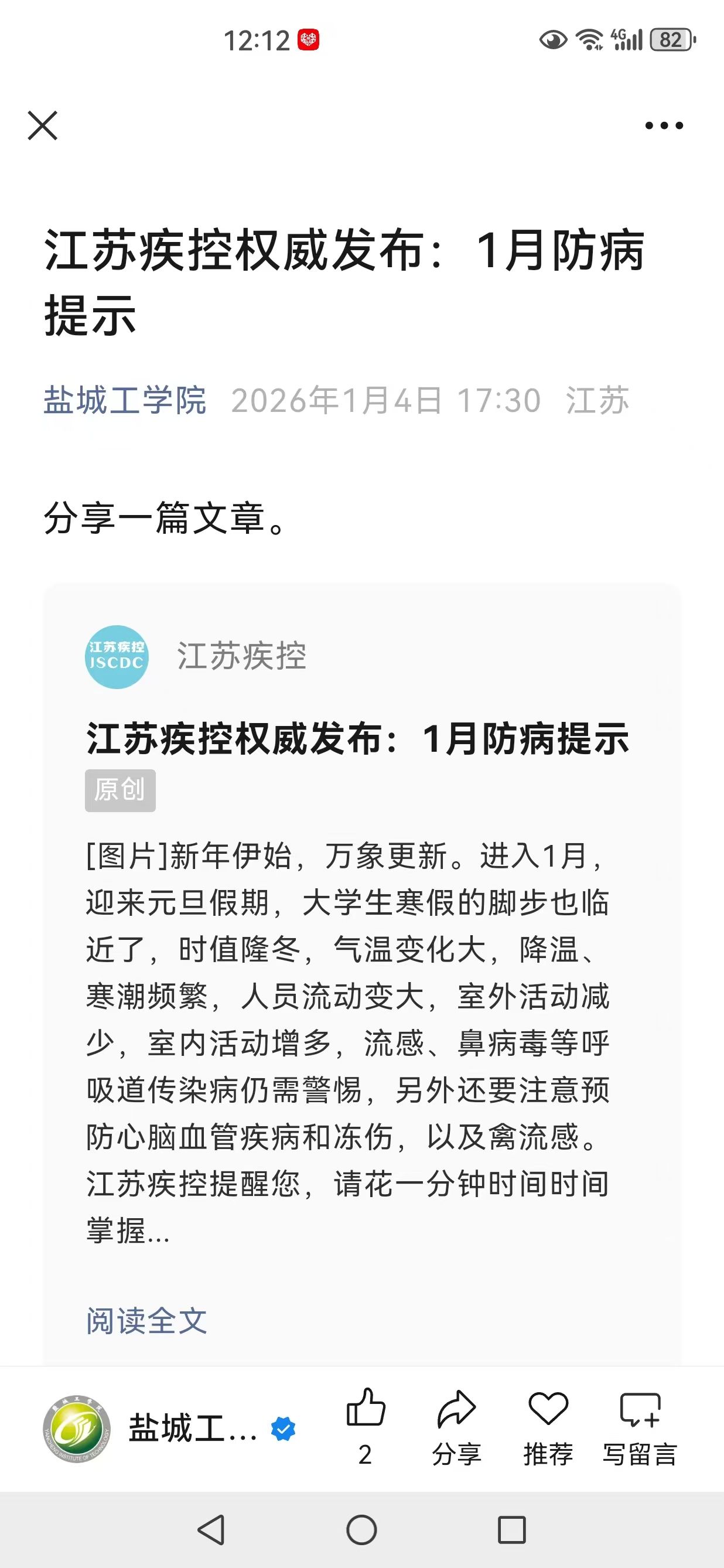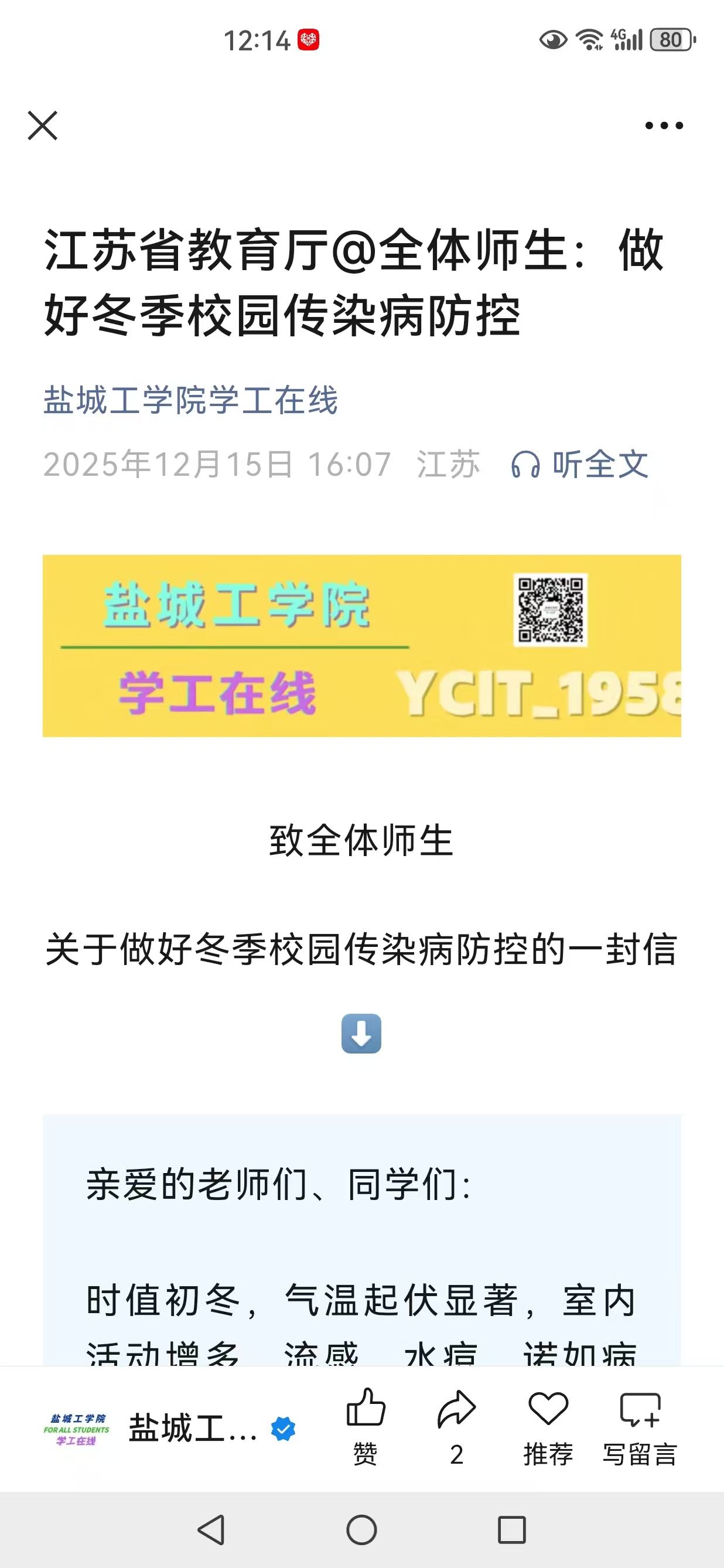 (1)线上阵地广泛覆盖:充分利用学校官网、微信公众号、校园APP、班级群等平台,定期发布冬季传染病防治知识推文、图文解读和科普短视频。内容涵盖流感与普通感冒的区别、诺如病毒的症状与处置、冬季传染病防治知识等。