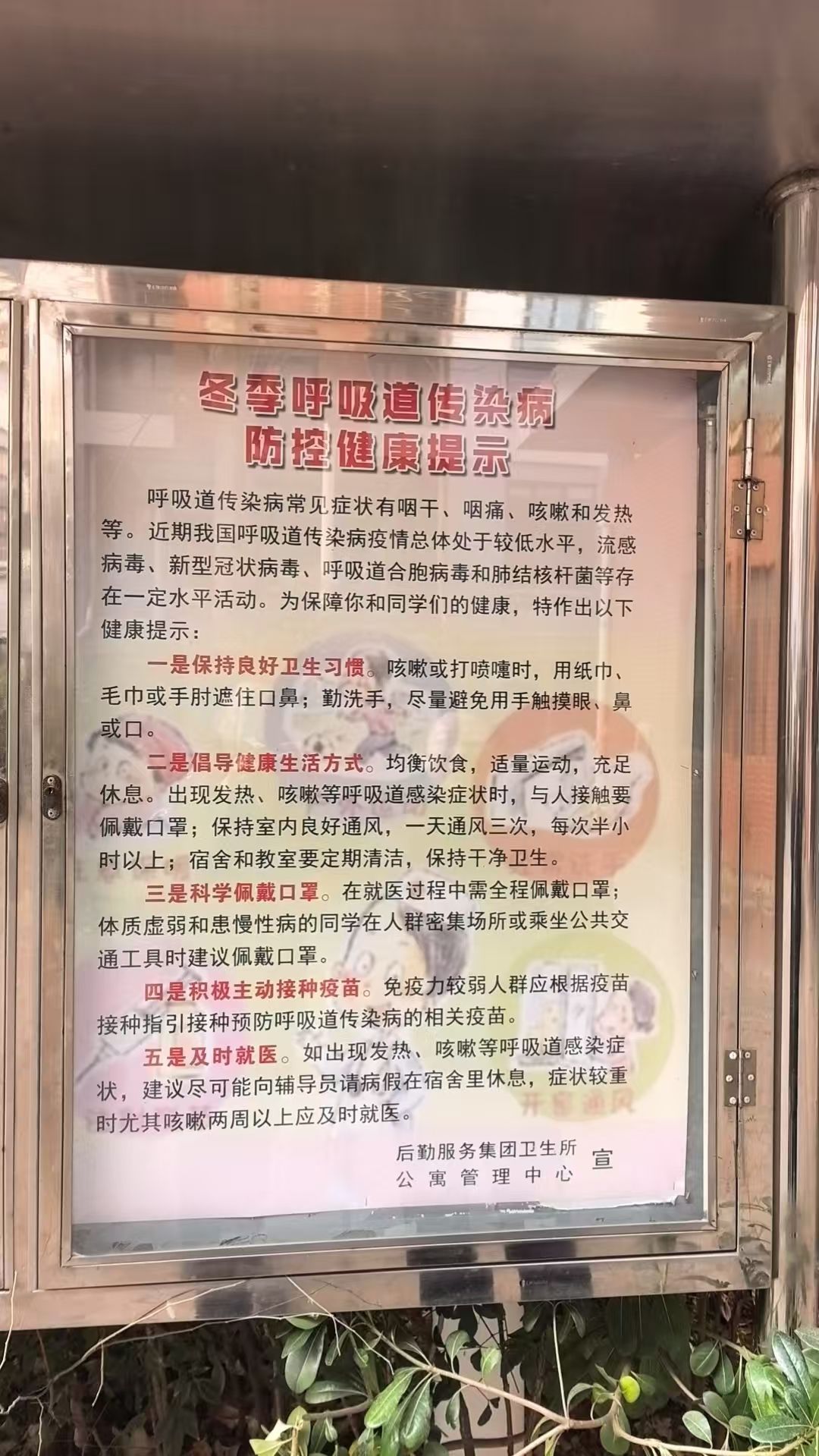 (2)线下宣传直观醒目:在宿舍区、食堂、卫生所等人员密集区域的宣传栏,张贴冬季传染病防控主题海报、标语,确保健康教育抬眼可见、随处可学。